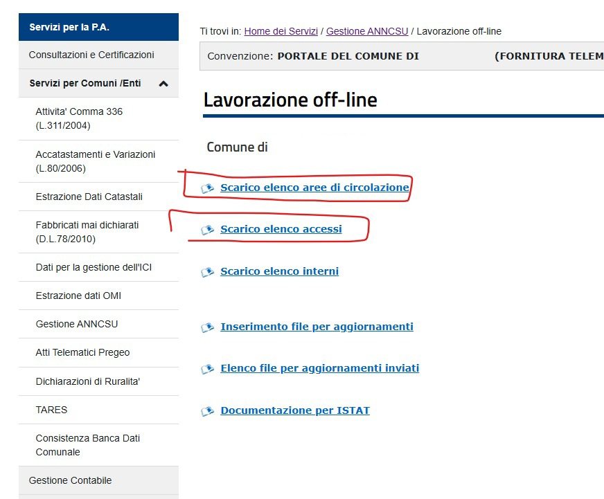 Accedere al portale SISTER e raggiungere la [Lavorazione off-line] e cliccare i due link evidenziati per ottenere il csv dal link delle aree di circolazione (Fig. 2) e un file zip da “Scarico elenco accessi”