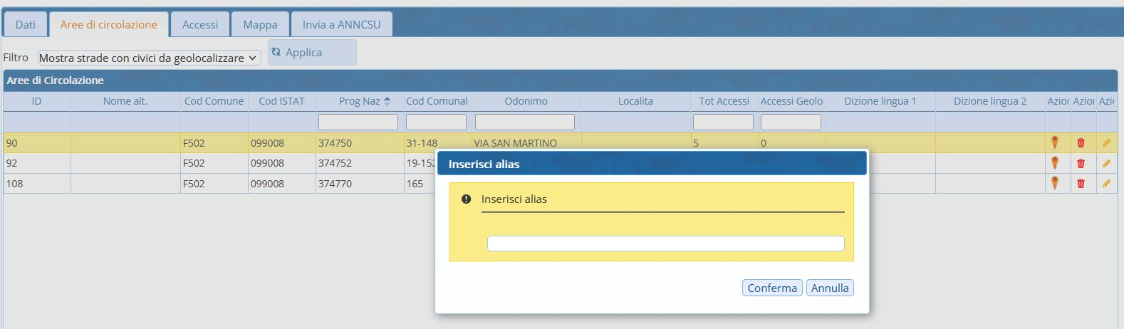 (PIN arancione): Consente di inserire un alias (Fig. 5), una descrizione alternativa all’area di circolazione che si visualizza nella colonna [Nome alt.]. Questo valore deve essere lo stesso che usa Google per individuare la strada, dal nostro esempio potrebbe essere [VIA S. MARTNO], quindi valorizzare solo dopo aver verificato come Google Maps cerca (codifica) quell’indirizzo.