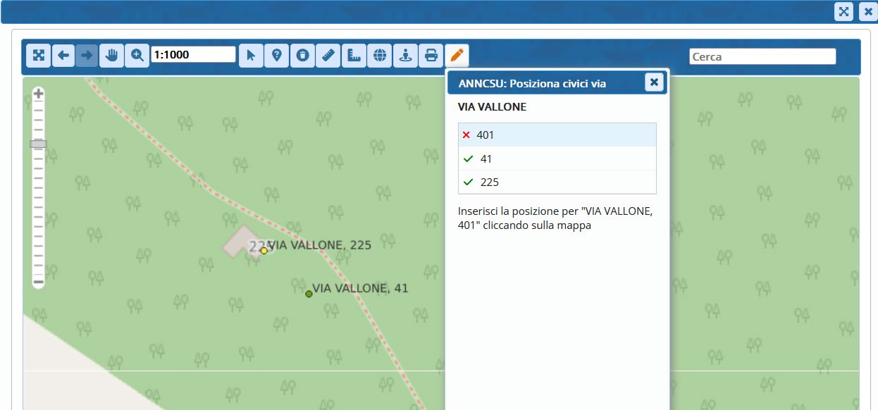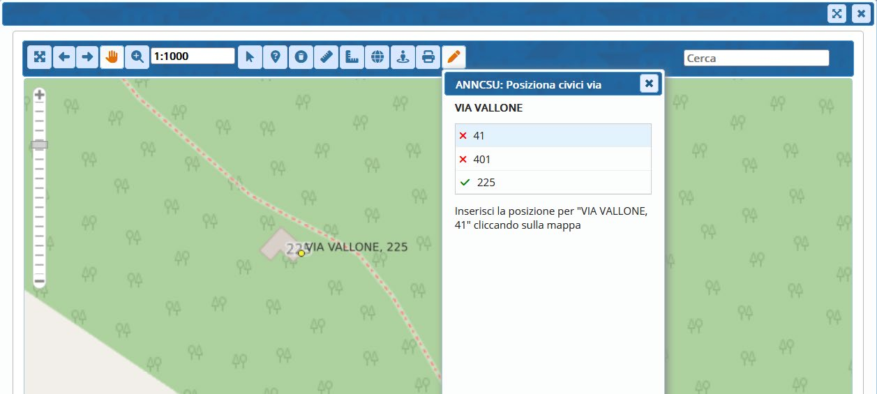 (matita gialla): Posiziona in modo speditivo i civici dell’area di circolazione (Fig. 1.3.4), nell’esempio il civico con la spunta verde è quello già posizionato (VIA VALLONE 225). Il primo della lista, VIA VALLONE 41, è quello che sta per essere posizionato, basta cliccare un punto in mappa e la lista si aggiorna come in Fig. 6.