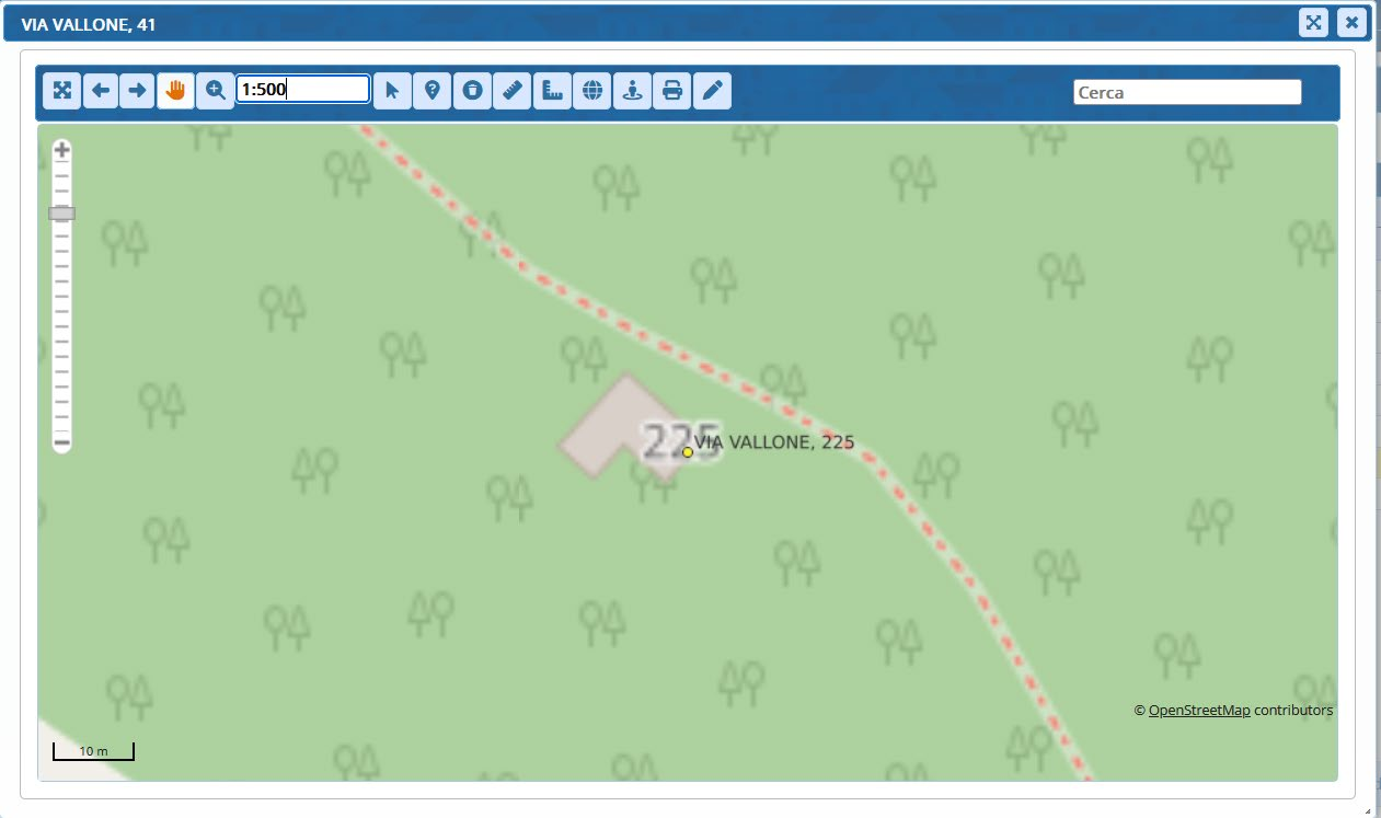 ) sul civico VIA VALLONE 41, si visualizza la stessa finestra grafica ma lo zoom è estremamente ravvicinato, in quanto il sistema riconosce che ci sono altri civici geolocalizzati (VIA VALLONE 225) e quindi effettua lo zoom nella stessa zona ipotizzando che il nuovo civico da posizionare possa essere lì vicino… (Fig. 9). Per geolocalizzare il civico, cliccare il bottone con la matita