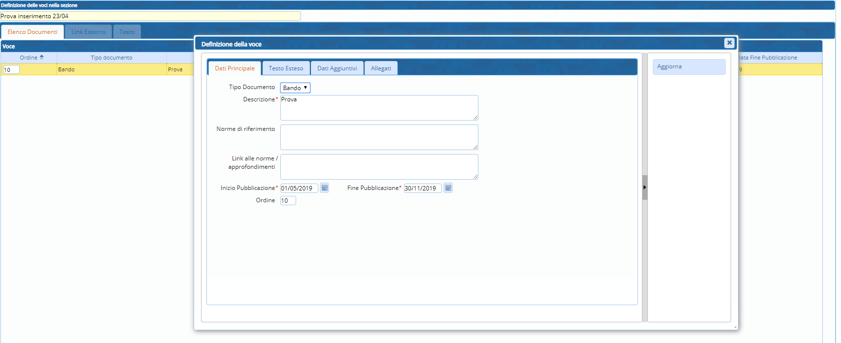 Se abilitiamo il permesso “Aggiornamento” il membro del gruppo può aprire il dettaglio delle voci della sezione e modificare tutti i dati (in questo caso c'è il bottone 'Aggiorna').