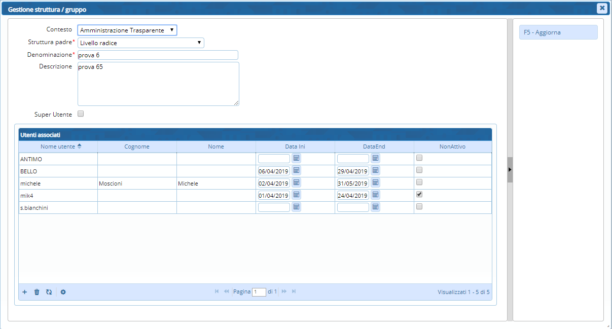 Se abilitiamo il permesso “Aggiornamento Sezione” al gruppo prova6, il membro del gruppo può aprire la gestione della sezione e modificare tutti i dati (in questo caso c'è il bottone 'Aggiorna').