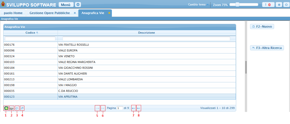 Da questa schermata sarà anche possibile inserire una nuova via utlizzando il bottone Nuovo o ritornare alla schermata iniziale utilizzando il bottone Altra Ricerca