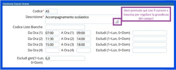 Ad esempio: una fascia d'orario come “Accompagnamento Scolastico” la possiamo inserire con le sue iniziali (Codice AS).