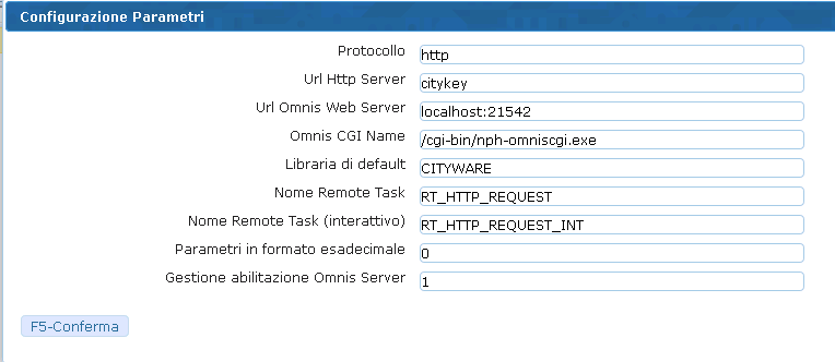 Protocollo: http Url Http Server: [indirizzoHttpServer:porta] Url Omnis Web Server: [indirizzoOmnisServer:porta] Omnis CGI Name: /cgi-bin/nph-omniscgi.exe Libraria di default: CITYWARE Nome Remote Task: RT_HTTP_REQUEST Nome Remote Task (interattivo): RT_HTTP_REQUEST_INT Parametri in formato esadecimale: 0 Gestione abilitazione Omnis Server: 1