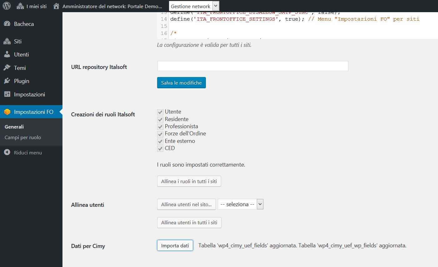 Il plugin principale del framework mette a disposizione il menu “Impostazioni FO” nella gestione Network e nei singoli siti.