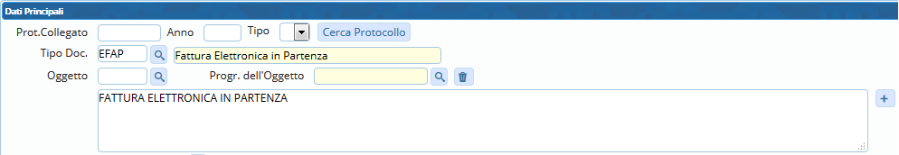 Per scegliere un tipo di documento dall’elenco in fase di protocollazione, cliccare sulla lentina accanto al campo Tipo Doc.. Selezionando una voce dall’elenco, verranno inseriti il tipo di documento, il codice e il testo dell'oggetto associato.