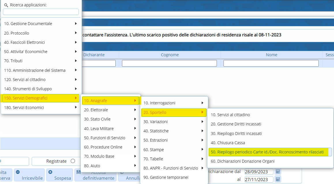 Servizi demografici ⇒ Anagrafe ⇒ Sportello ⇒ Riepilogo periodico carte id./Doc. riconoscimento rilasciati