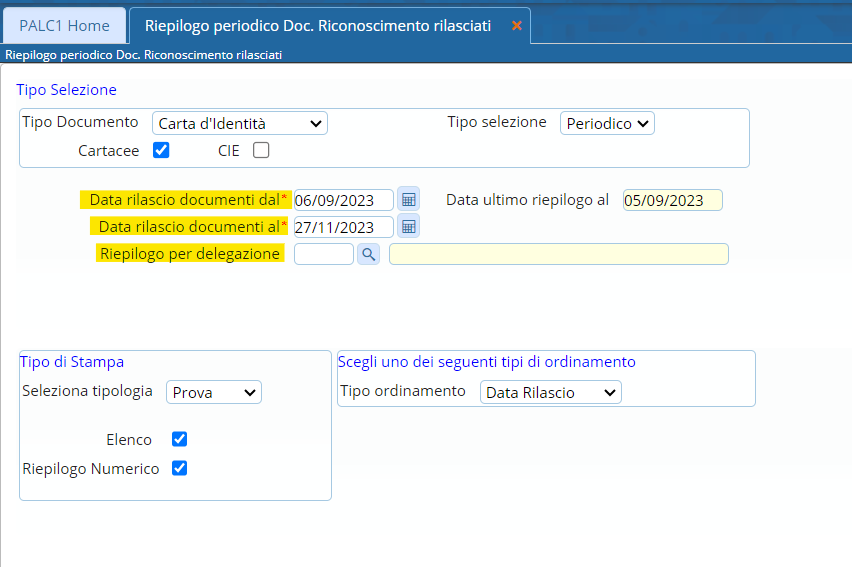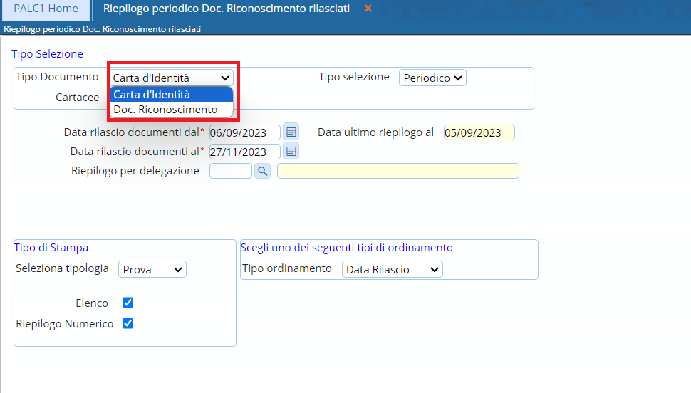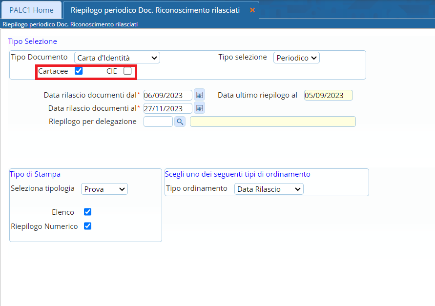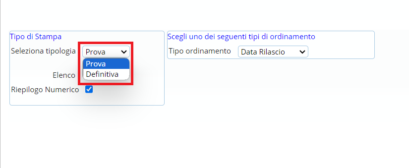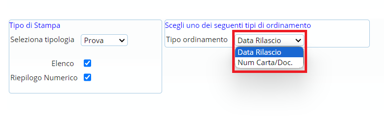 Inoltre è possibile indicare se la stampa sarà “Provvisoria” o “Definitiva” e l’ordinamento di quest’ultima ⇒ “Data rilascio” o “Num.carta/Doc.”