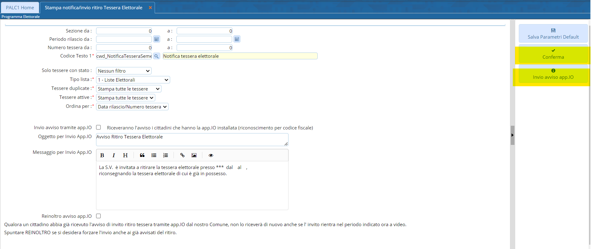 Questo programma permette la stampa o invio sull'App.io delle notifiche di ritiro tessera elettorale, è necessario compilare i campi, selezionare il testo di riferimento e a seconda della compilazione è possibile optare per l'invio attraverso App. Difatti a destra ci sono due pulsanti differenti, conferma per la stampa e invio per l'altra opzione.