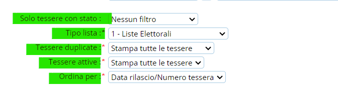 - Tessere Duplicate ⇒ permette di stampare, riferendosi agli altri filtri: tutte le tessere, solo le duplicate, tutte quelle NON duplicate.
